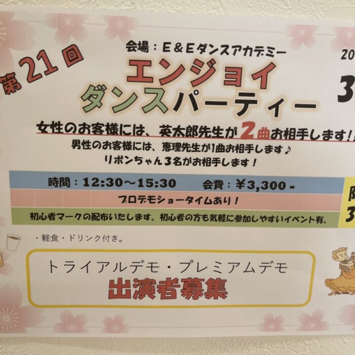 3/8(日)教室にてエンジョイダンスパーティー開催します🎉 初心者の方🔰でも大歓迎✨ お問い合わせはE&E(052-764-7701)まで、よろしくお願いします。...